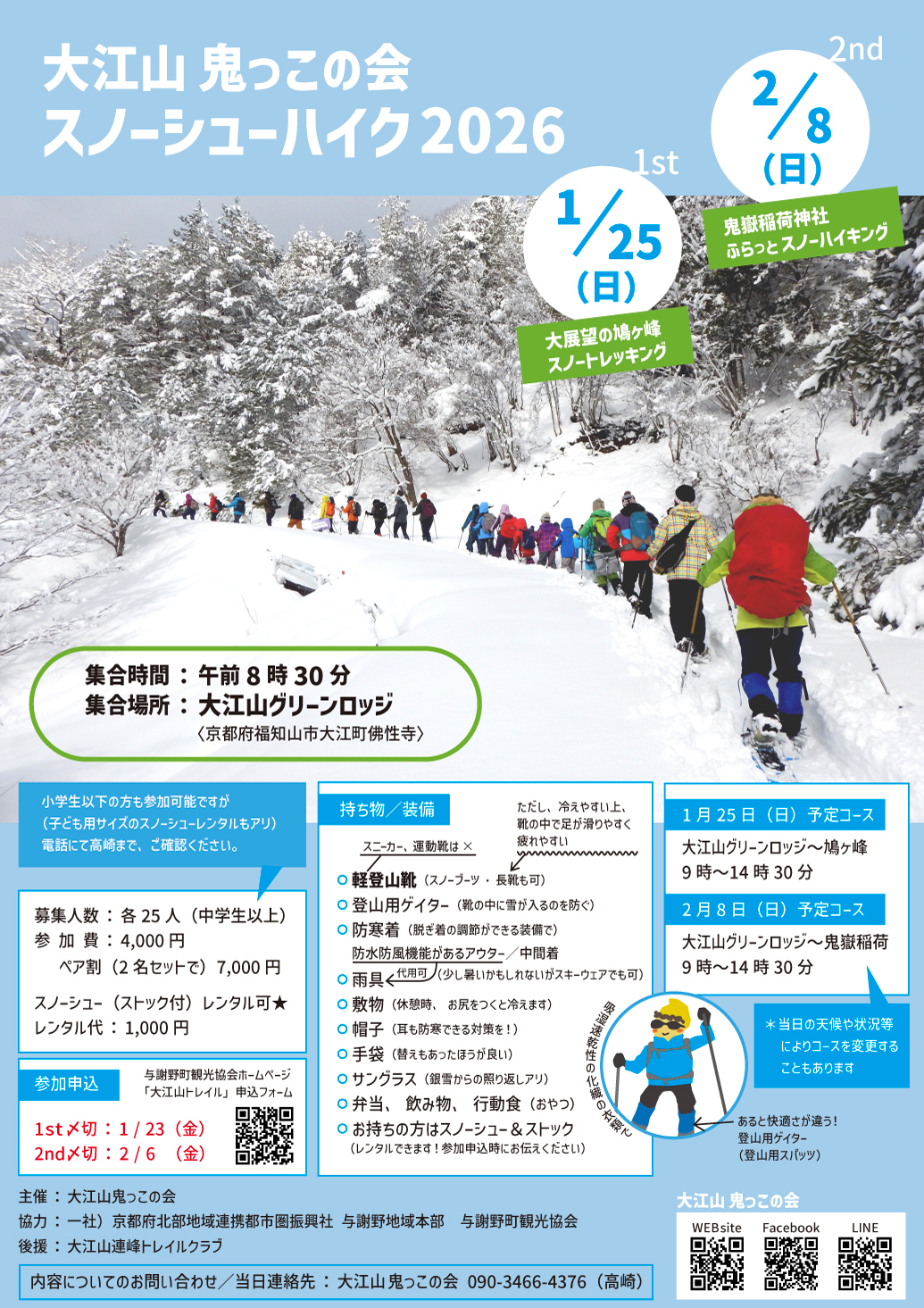 | 日時 | ①令和8年1月25日(日) 大江山グリーンロッジから鳩ヶ峰「スノートレッキング」 ②令和8年2月8日(日) 大江山グリーンロッジから鬼嶽稲荷神社 「ふらっとスノーハイキング」 ※両日とも午前8時30分に大江山グリーンロッジ集合 ※参加には事前申し込みが必要です |