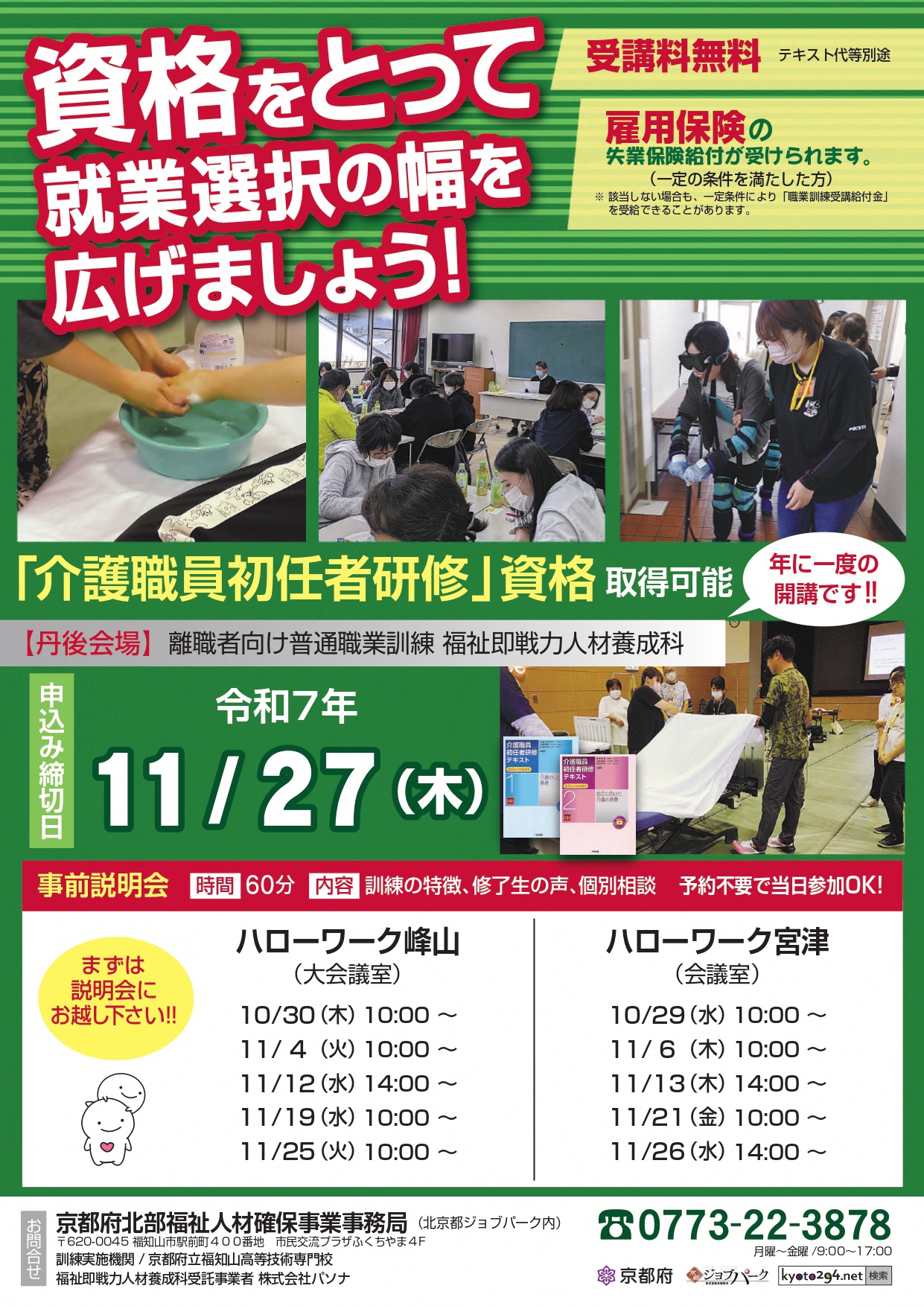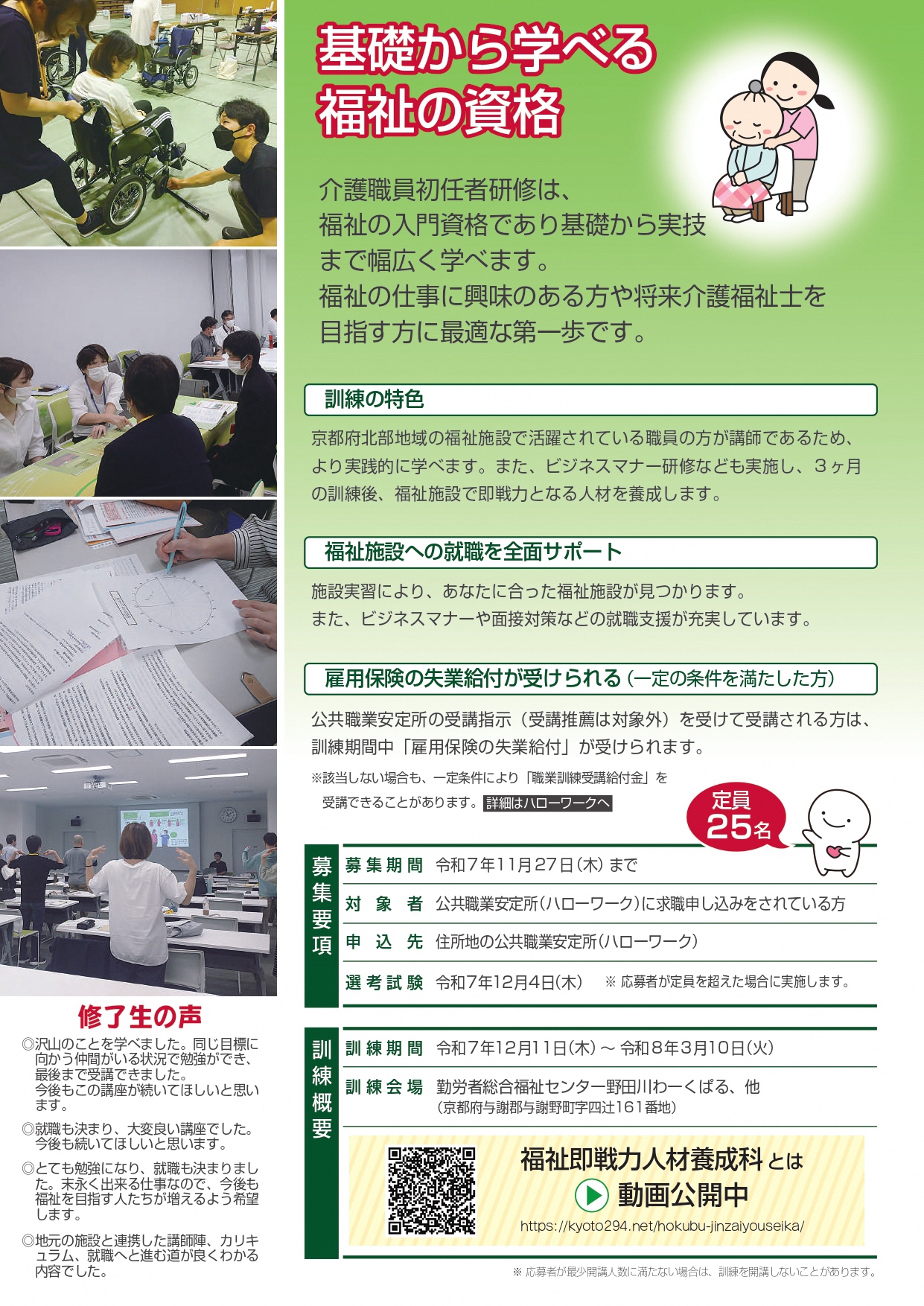 福祉即戦力人材養成科のご案内 福祉課 印刷 最終更新2025年10月30日(木) 08時30分 この記事を共有する 福祉即戦力人材養成科ちらし(表) 福祉の仕事に興味のある方、福祉職に再就職したい方、将来介護福祉士を目指す方に最適な研修です。 募集期間 令和7年11月27日(木)まで 研修期間 令和7年12月11日(木)~令和8年3月10日(火) 会場 野田川わーくぱる ほか ハローワークでの事前説明会も予定されています。詳しくは添付のちらしをご覧ください。