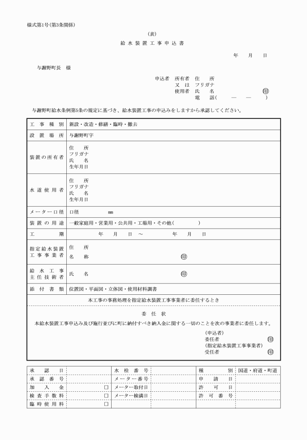 (1) 給水装置の使用を開始し、廃止し、又は中止しようとするときは、水道使用届(様式第4号)の提出をもって行うこと。