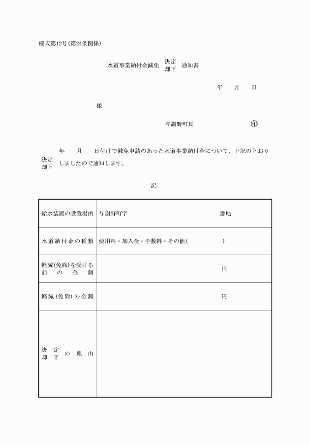 (2) 給水装置の用途を変更しようとするときは、給水装置用途変更届(様式第7号)の提出をもって行うこと。